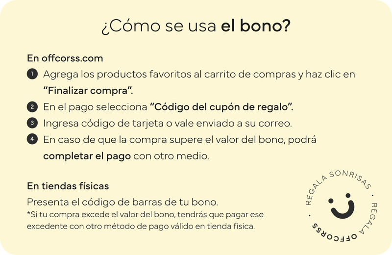 Restricciones: no es válido para comprar otros bonos regalo ni puede cambiarse por dinero en efectivo. Recuerda que al momento de proceso tu compra solo puedes comprar bonos o prendas, no puedes hacer una compra con ambos artículos. No aplica para pagos contraentrega.