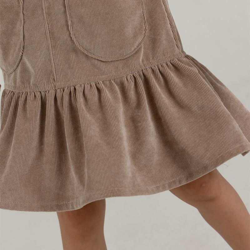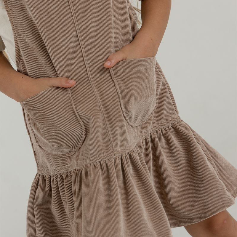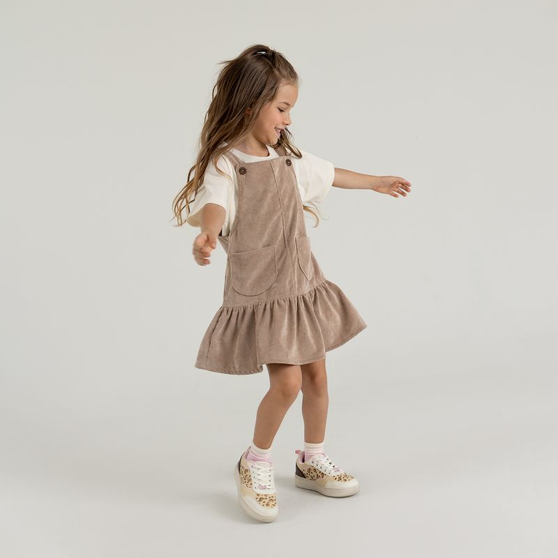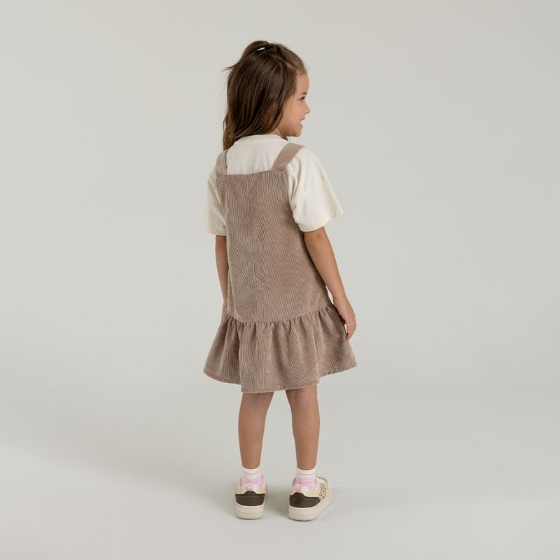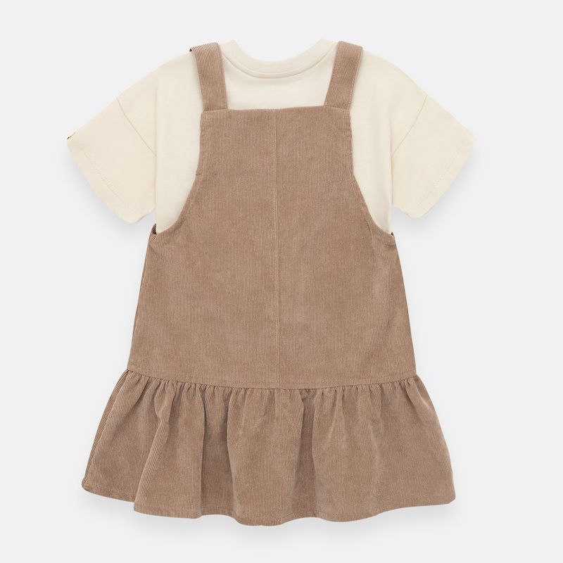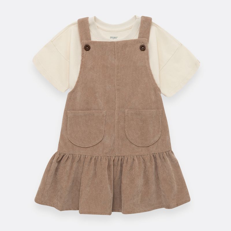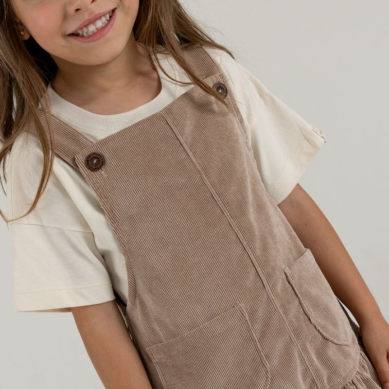 Conjunto de camiseta manga corta en tejido de punto silueta clásica + jardinera en corduroy en tejido plano silueta amplia con cargaderas ajustables y prenda con proceso sostenible.